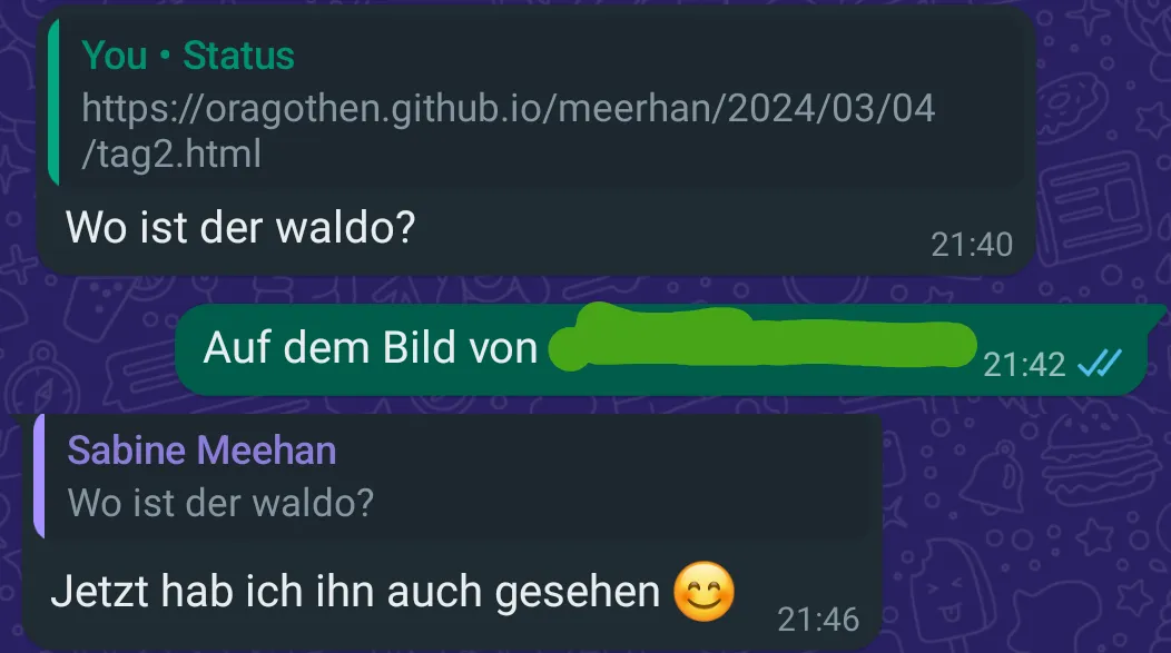 Lily fragte mich gestern Abend, warum sie nicht auf Platz 1 der Waldo Suche war, obwohl sie Waldo als erste gefunden hat. Ich wies sie darauf hin, dass sie Waldo auf dem Bild platzierte, und damit disqualifiziert ist. Special mentions an meine Mutter und an Maxim.