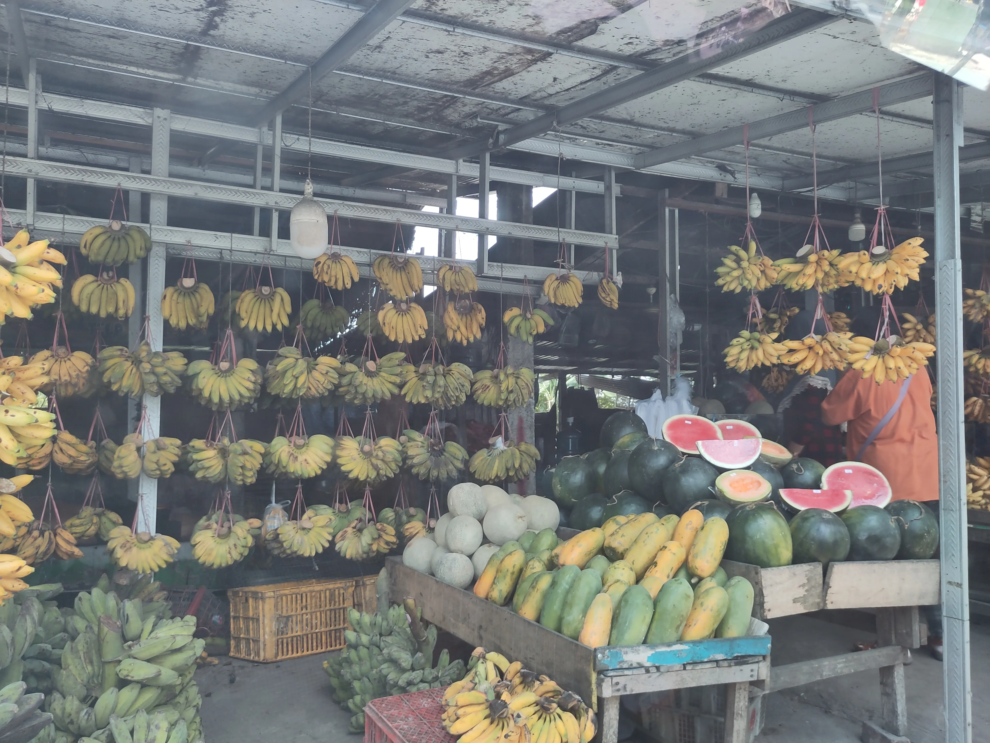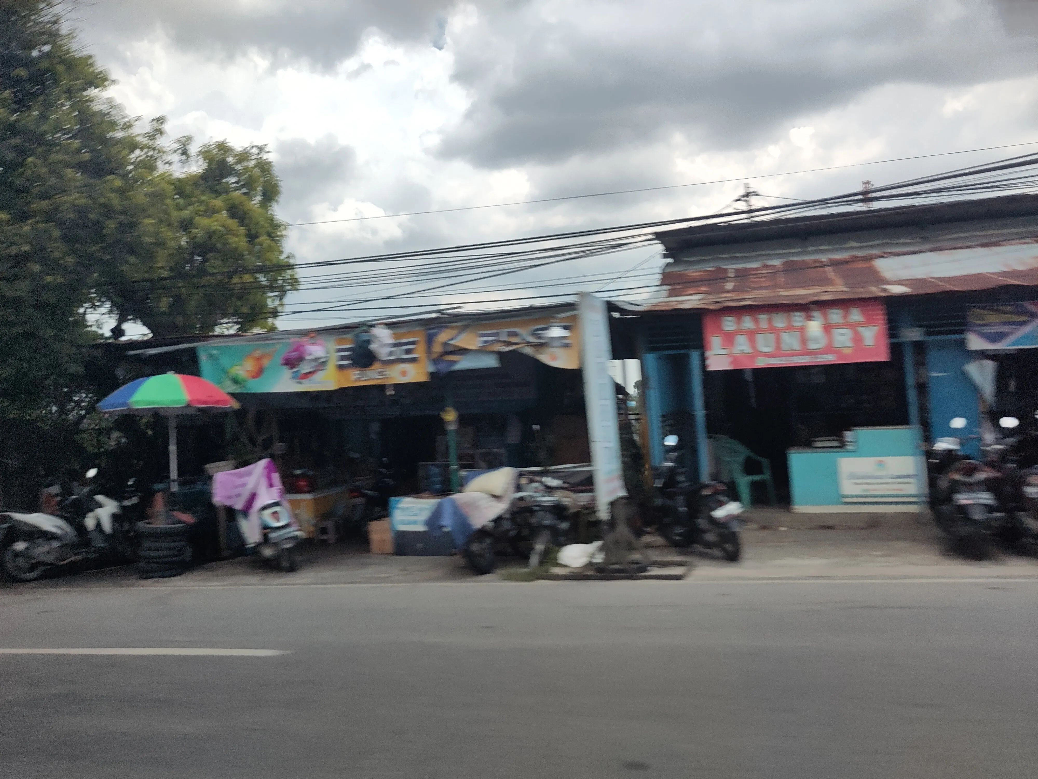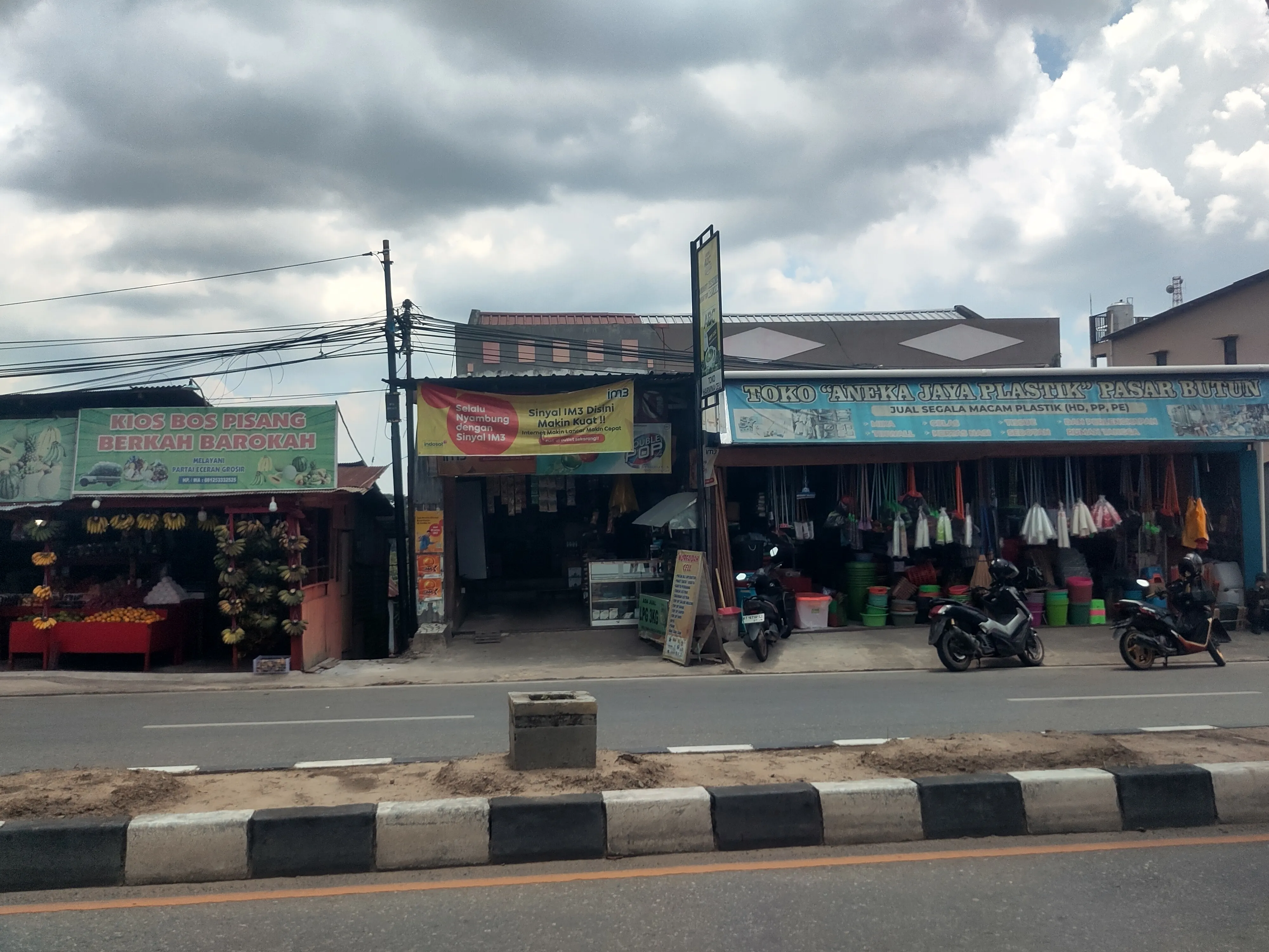 Als Erstes möchte ich über das Konzept des “Warung” reden. Warung bedeutet einfach nur “Laden” bzw “Stand”, und ist eine von den Sachen, die ich hier wohl am häufigsten gesehen habe. Die gesamte Straße, fast überall, ist gesäumt von Warungs (man achte auf den deutschen Plural, der darauf hinweist, dass ich Warung als eigenes Konzept akzeptiere). Was verkaufen Warungs? Alles. Jeder kann einen Warung eröffnen; das einzige, was man braucht, ist ein kleiner Tisch, ein paar Quadratmeter, wo man den Tisch aufbauen kann, und ein Produkt, und insbesondere keine Gaststättenerlaubnis, Baugenehmigung, oder ähnliches. Ich habe Warungs gesehen, die Bananen, Obst, Gemüse verkaufen, frisches Essen, gekochtes Essen. Eistee, Kaffee, andere Getränke. Durians und nichts anderes. Bubur, gebratener Reis, Grillhähnchen. Stoff, Kleidung, Schuhe. Motorradhelme. Motorradreparaturen. Wenn es etwas gibt, das Leute kaufen wollen, gibt es vermutlich einen Warung, der es verkauft, vermutlich in der nächsten Seitenstraße. Weil heute kaum was passiert ist, habe ich ein paar Fotos von Warungs hinzugefügt.