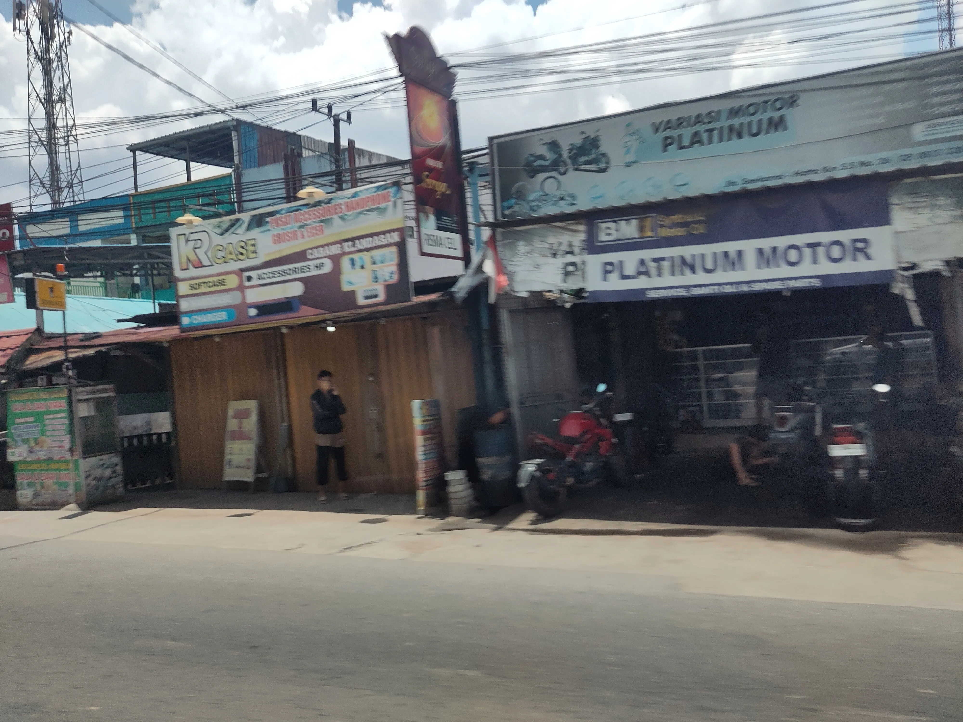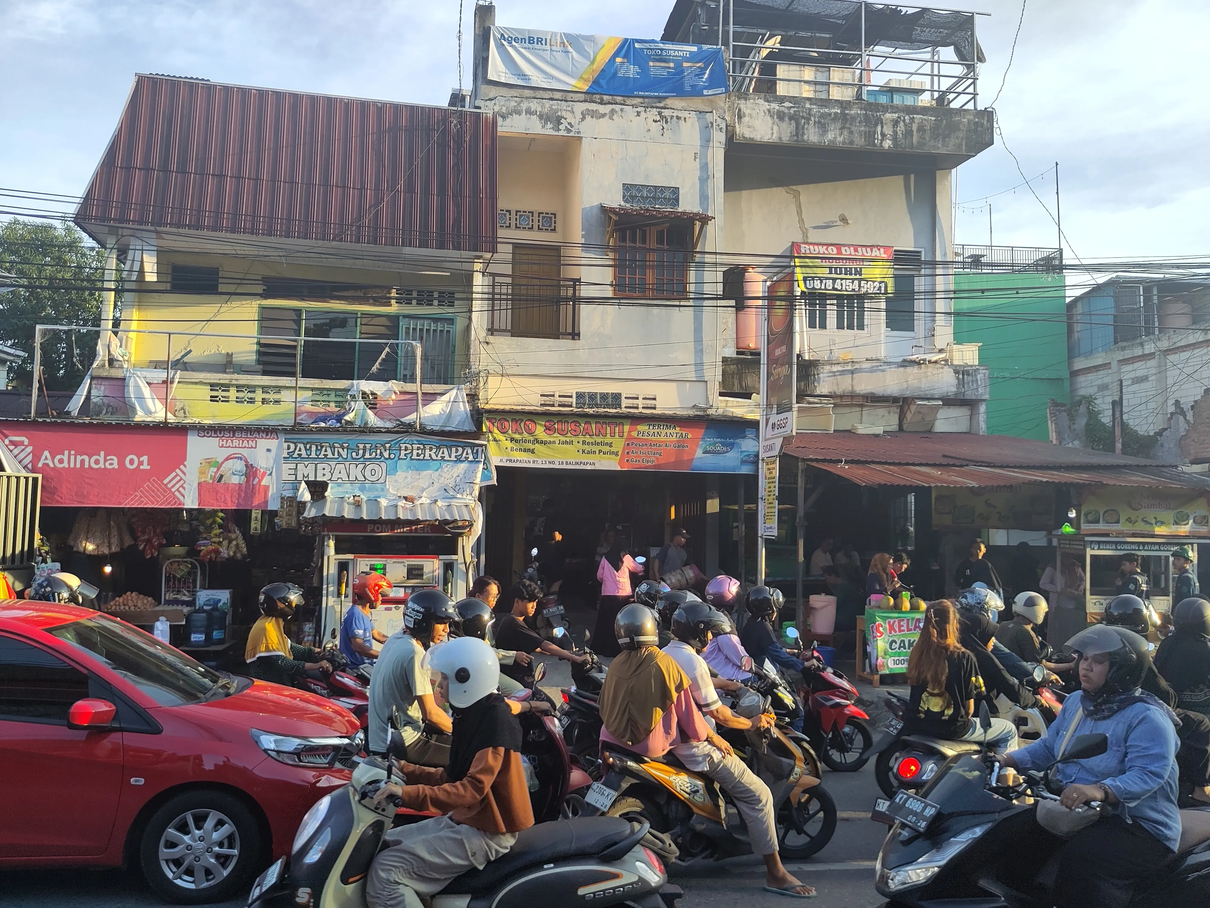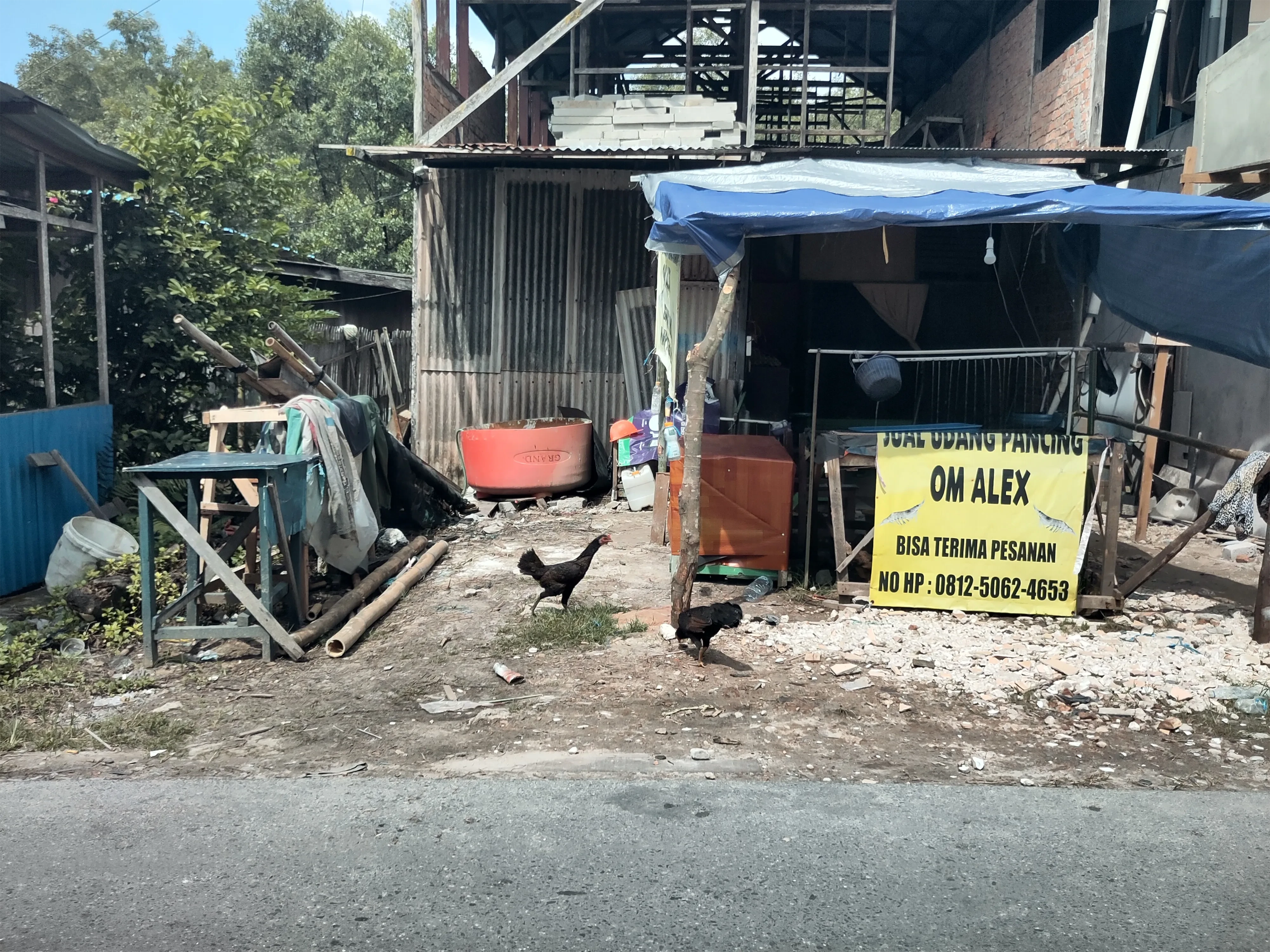 Als Erstes möchte ich über das Konzept des “Warung” reden. Warung bedeutet einfach nur “Laden” bzw “Stand”, und ist eine von den Sachen, die ich hier wohl am häufigsten gesehen habe. Die gesamte Straße, fast überall, ist gesäumt von Warungs (man achte auf den deutschen Plural, der darauf hinweist, dass ich Warung als eigenes Konzept akzeptiere). Was verkaufen Warungs? Alles. Jeder kann einen Warung eröffnen; das einzige, was man braucht, ist ein kleiner Tisch, ein paar Quadratmeter, wo man den Tisch aufbauen kann, und ein Produkt, und insbesondere keine Gaststättenerlaubnis, Baugenehmigung, oder ähnliches. Ich habe Warungs gesehen, die Bananen, Obst, Gemüse verkaufen, frisches Essen, gekochtes Essen. Eistee, Kaffee, andere Getränke. Durians und nichts anderes. Bubur, gebratener Reis, Grillhähnchen. Stoff, Kleidung, Schuhe. Motorradhelme. Motorradreparaturen. Wenn es etwas gibt, das Leute kaufen wollen, gibt es vermutlich einen Warung, der es verkauft, vermutlich in der nächsten Seitenstraße. Weil heute kaum was passiert ist, habe ich ein paar Fotos von Warungs hinzugefügt.